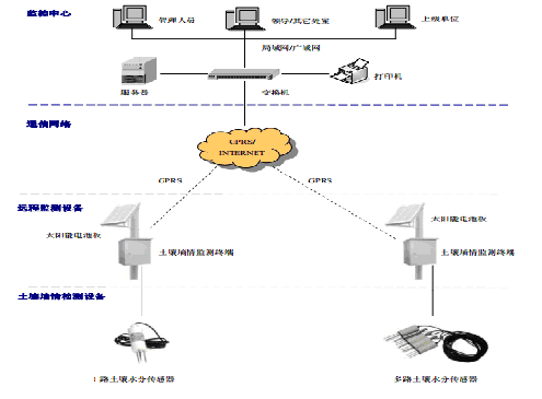 該系統(tǒng)主要由監(jiān)控中心、通信網(wǎng)絡(luò)、遠程監(jiān)測設(shè)備和土壤墑情檢測設(shè)備四部分構(gòu)成。