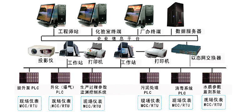 城市污水處理廠自動(dòng)控制系統(tǒng)采用計(jì)算機(jī)十PLC+現(xiàn)場(chǎng)儀表構(gòu)成的分布式控制系統(tǒng)。系統(tǒng)設(shè)置一個(gè)中央
